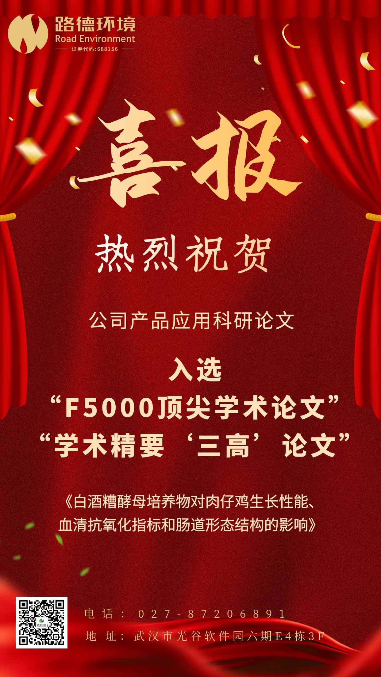 公司与中国农业科学院饲料研究所家禽营养与饲料创新团队共同完成并发表于《动物营养学报》(2019,31(5): 2357-2366)的学术论文—《白酒糟酵母培养物对肉仔鸡生长性能、血清抗氧化指标和肠道形态结构的影响》,入选2022年度“领跑者5000—中国精品科技期刊顶尖学术论文(F5000)”和学术精要(2023年5-6月)高PCSI论文、高被引论文和高下载论文。