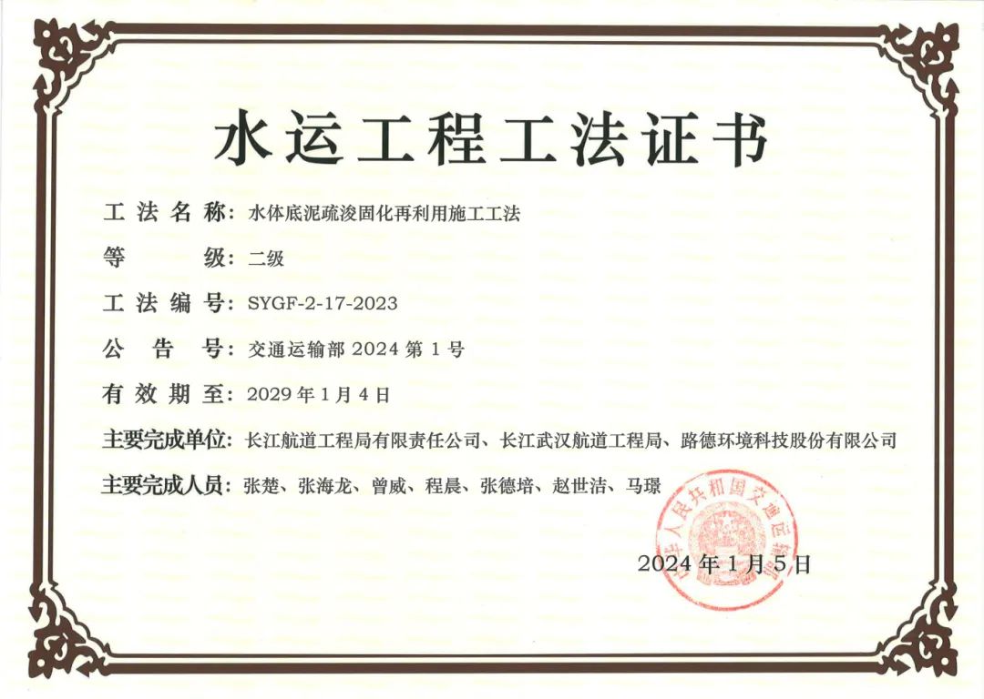 近期,交通运输部公布了2023年度水运工程工法评审结果,九游jiuyou(中国)环境联合长江航道工程局有限责任公司、长江武汉航道工程局共同申报的“水体底泥疏浚固化再利用施工工法”荣获交通运输部2023年度水运工程二级工法。